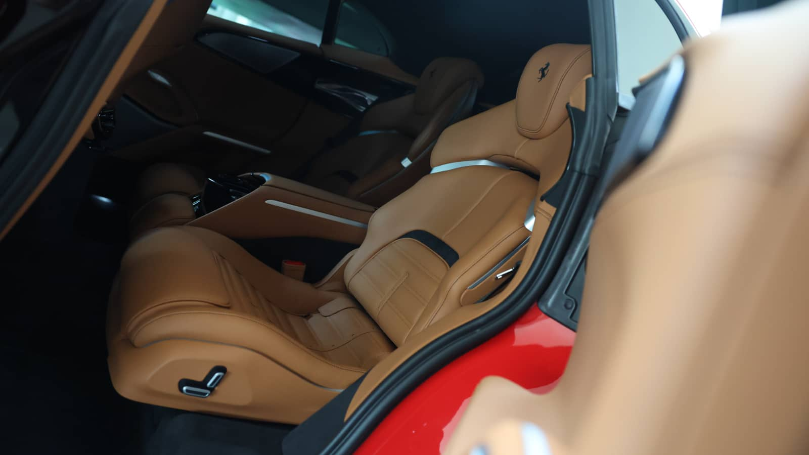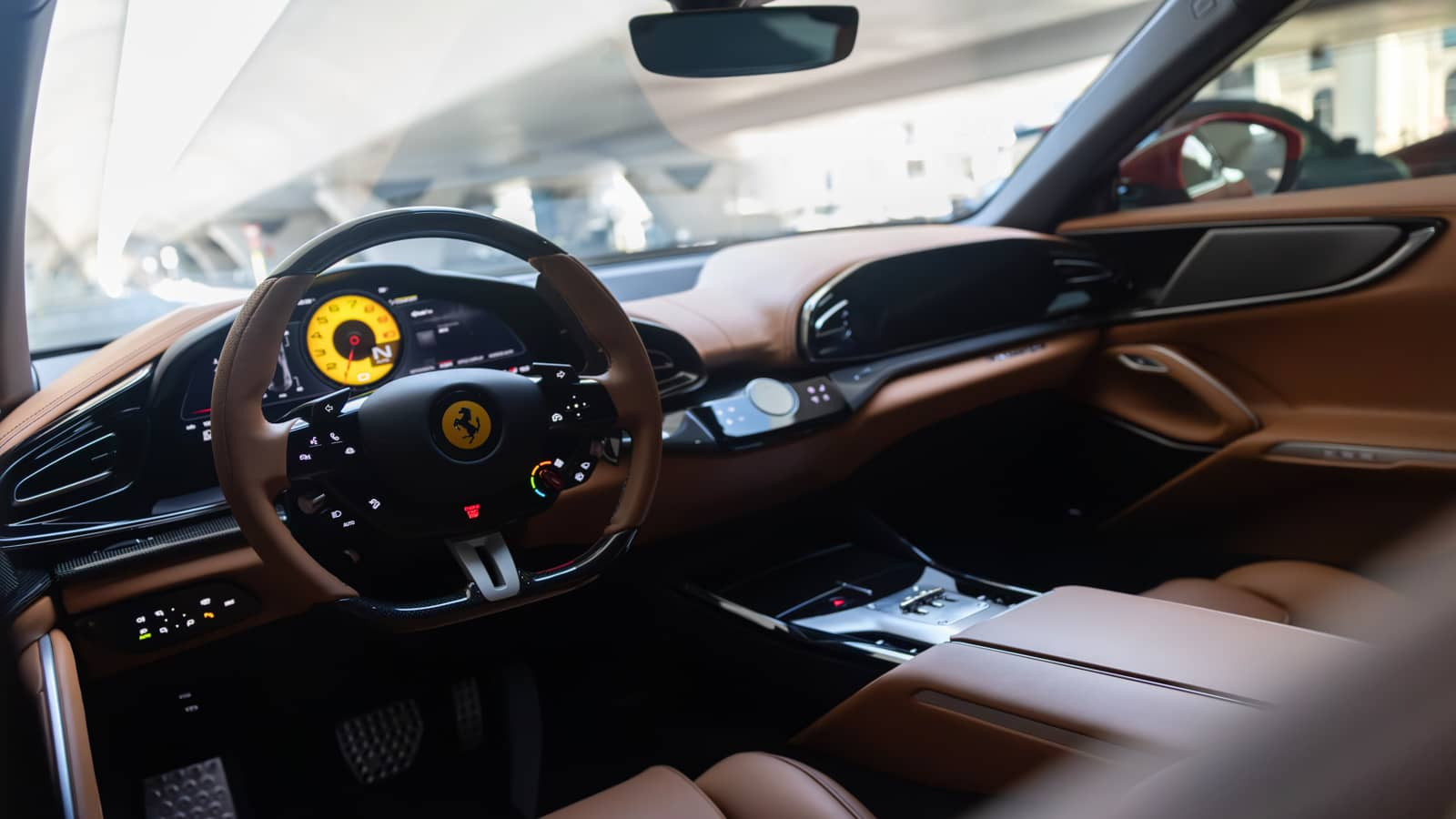 The Purosangue’s cabin is the most spacious Ferrari interior ever created, yet it retains the driver-focused layout the brand is known for. Four individual seats — each heated and ventilated — are separated by a full-length centre console. The rear passengers get their own climate controls, display screen, and the kind of legroom that makes this a genuine four-adult car. The panoramic glass roof floods the cabin with light.