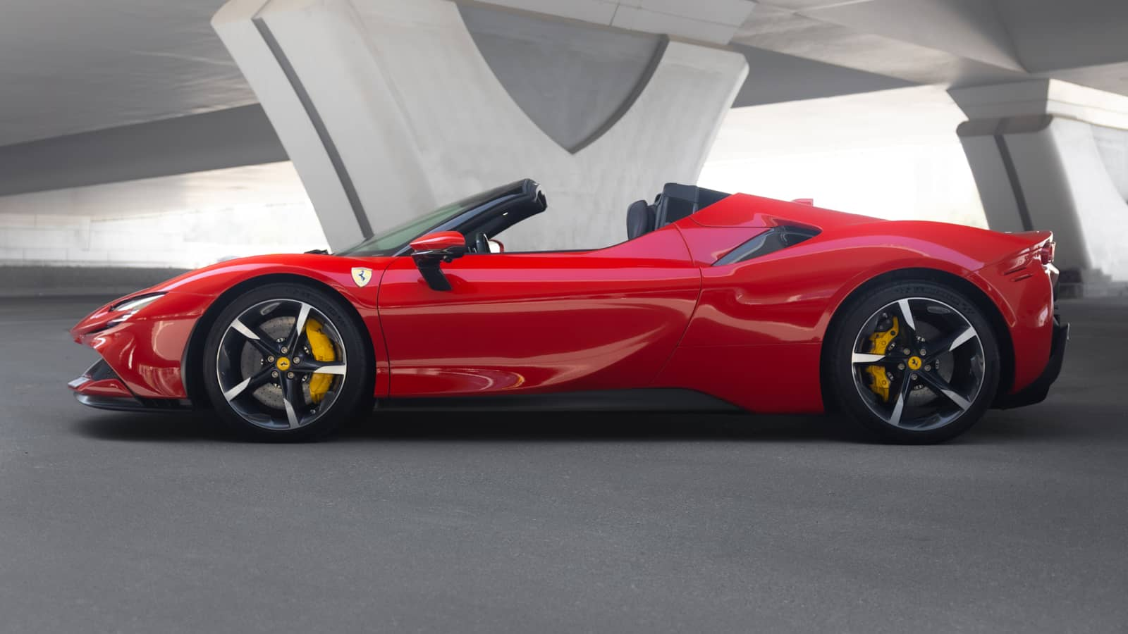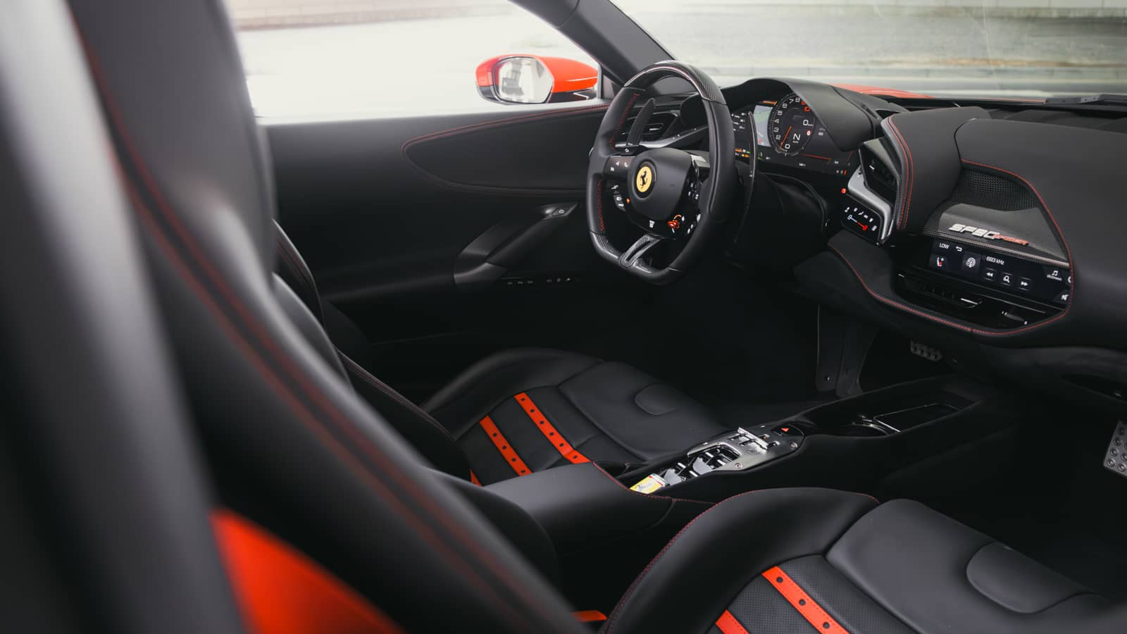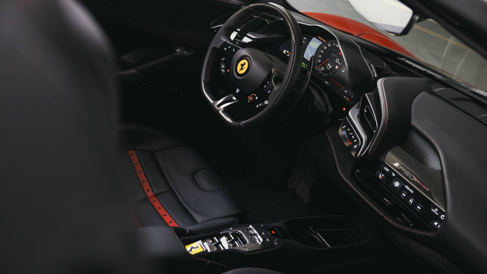 The SF90’s cockpit is the most advanced Ferrari cabin ever created. A 16-inch curved HD digital instrument cluster replaces all analogue gauges. The steering wheel integrates all controls including a touch-sensitive surface for selecting driving modes. The head-up display projects essential data onto the windshield. Physical buttons are almost entirely eliminated in favour of haptic touch surfaces.