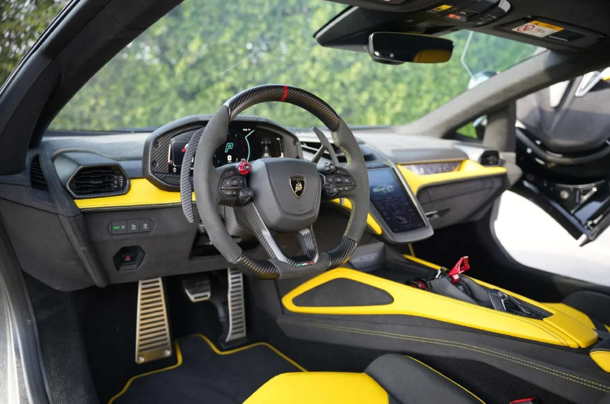 The Revuelto’s interior represents a quantum leap for Lamborghini, combining fighter jet aesthetics with genuine usability. The cockpit features three digital displays—a 12.3-inch instrument cluster, 8.4-inch central touchscreen, and 9.1-inch passenger display—allowing the co-pilot to monitor performance data and control entertainment. The “Feel Like a Pilot” philosophy puts all essential controls on the steering wheel, including the drive mode selector (Citta, Strada, Sport, Corsa, and new Citta EV mode). The exposed carbon fiber monocoque is visible throughout the cabin, reminding occupants of the engineering excellence surrounding them.