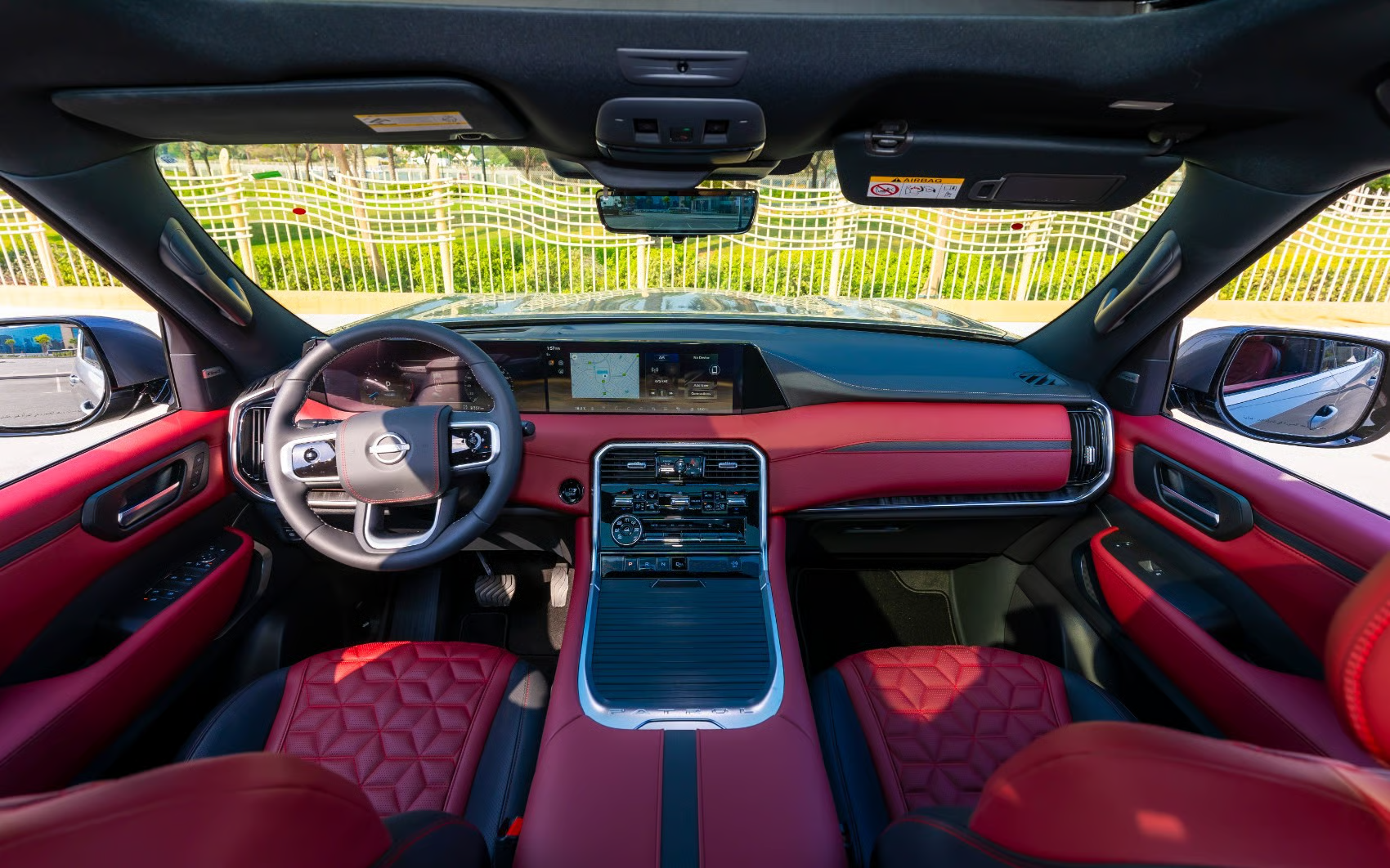 The 2026 Patrol’s interior is a dramatic transformation. Dual 14.3-inch displays span the dashboard, replacing the previous generation’s smaller screens with a fully digital, modern cockpit. Premium materials including quilted leather, real wood, and aluminium trim elevate the cabin to a level that competes with luxury brands. The second and third rows offer more space than ever, with captain’s chair options for the second row.